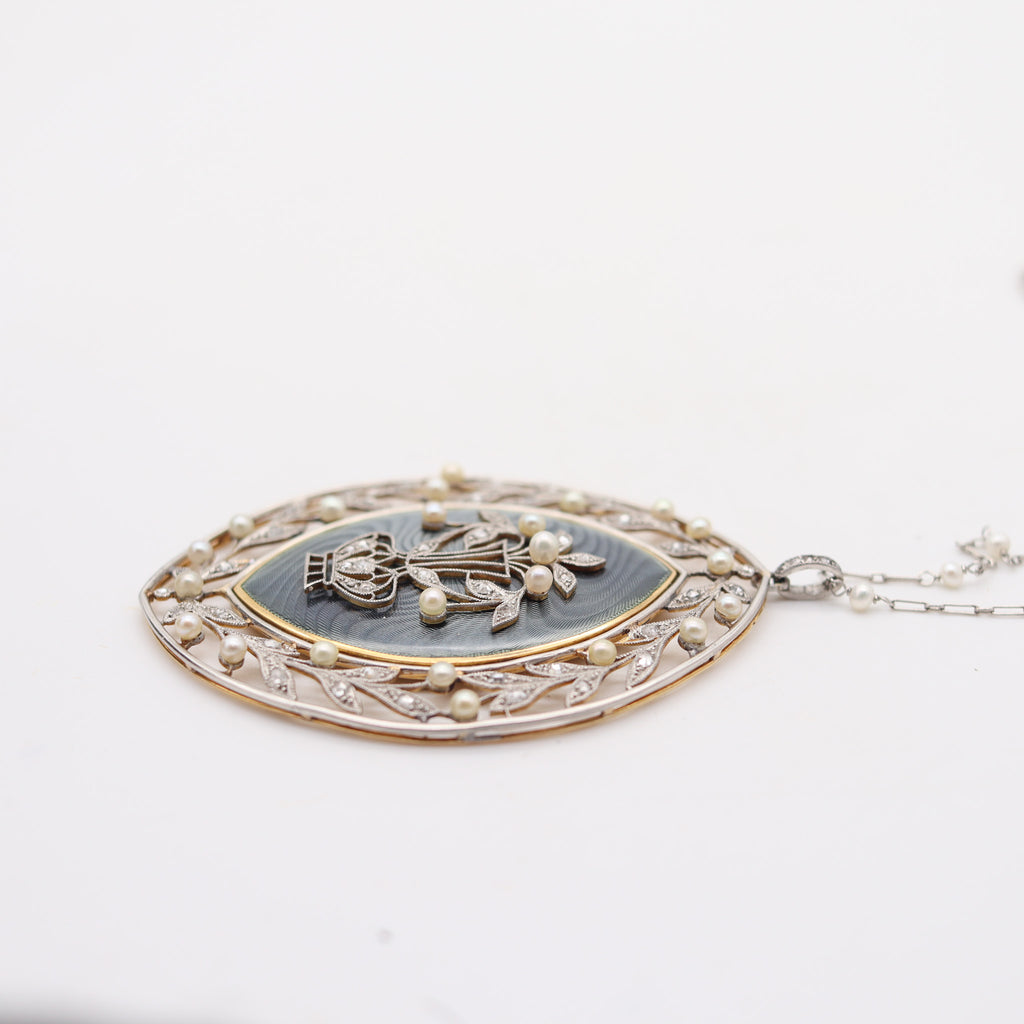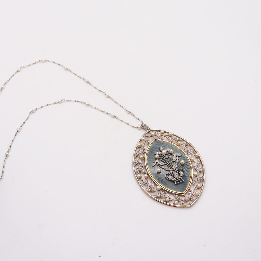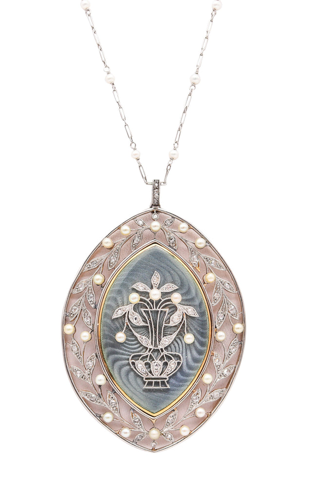 This is an amazing necklace-pendant created in Paris France during the belle epoque period by the jewelry house of Vever, back in the 1900-1910. The fabulous piece has been masterfully crafted in .900/.999 platinum and mounted with an almond-shaped panel embellished with engine turned patterns topped with blue-gray glass enamel. The platinum mounting is set with fifty-two rose cuts diamonds and forty-two natural white pears. Fitted with a movable oval ring with a pearls station chain with a spring ring lock.