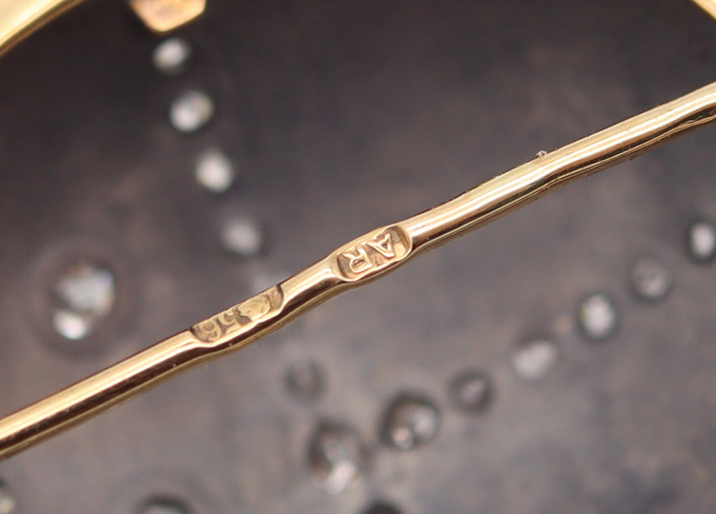 Hallmarks: Stamped with Imperial Russian marks, the pre-1899 mark of helmeted Athena facing to right with the letter associated for the city of St. Petersburg, the maker's mark AR inside an oval cartouche associated to Anna Ringe, the zolotnik standard mark 56 for the assay and warranty of the .583/.999 gold, remains of unidentified numbers and signed as follows, "AR 56".