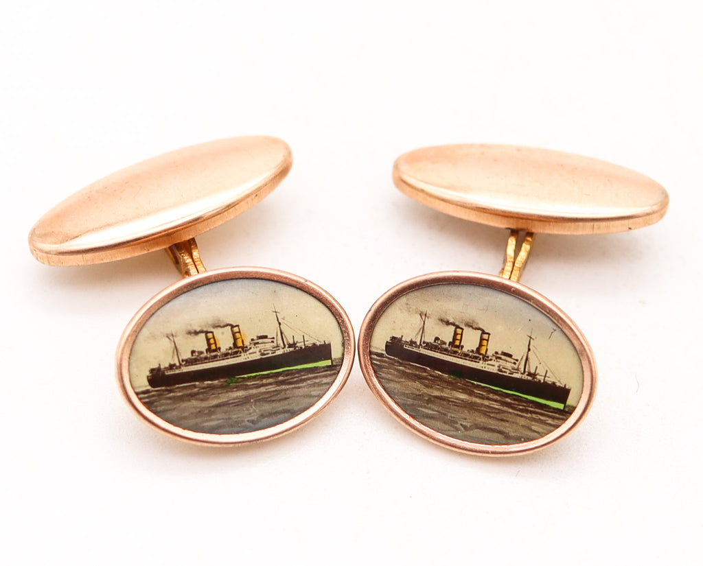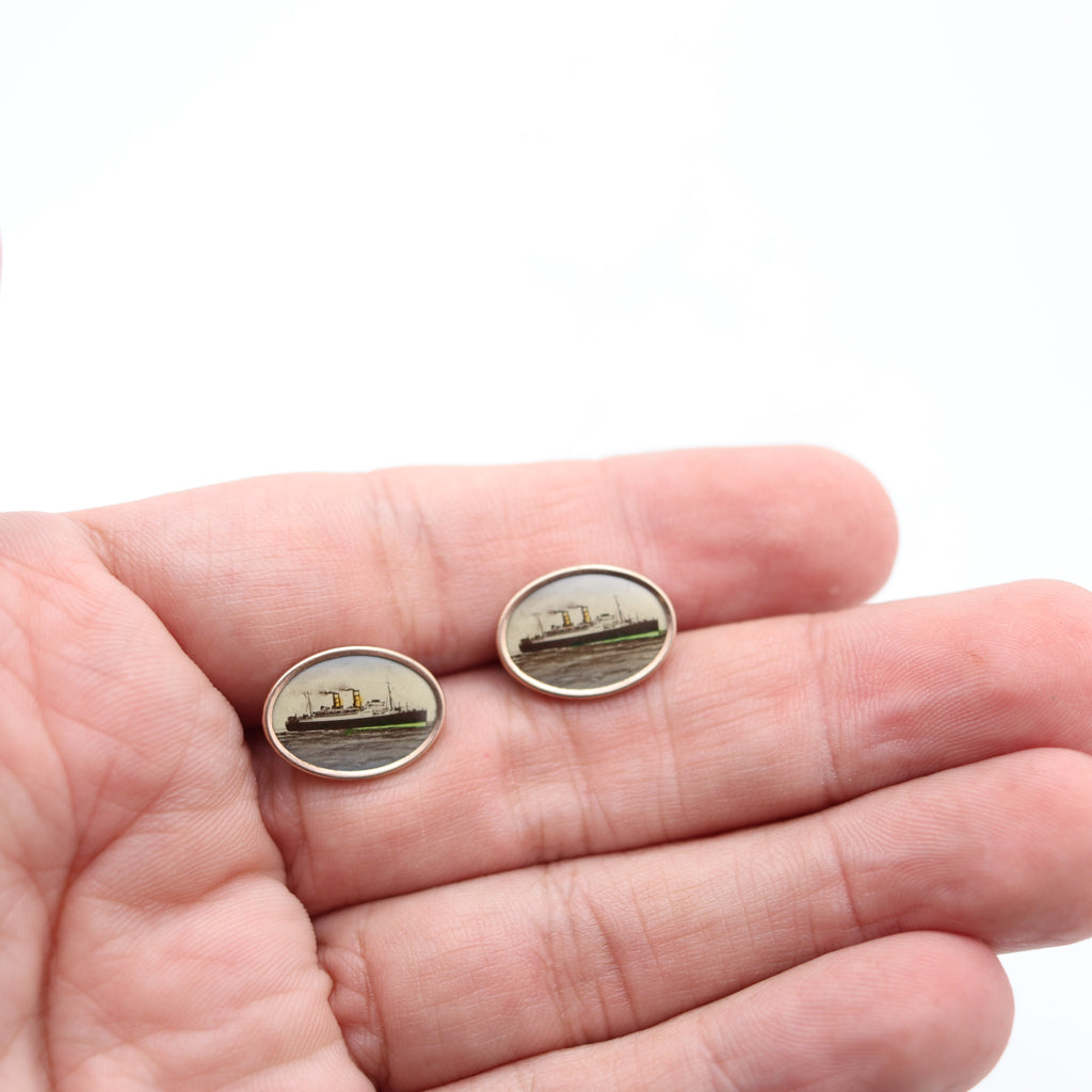 Collateral: This pair of art-deco Steamships cufflinks is accompanied by the original presentation jewelry box.