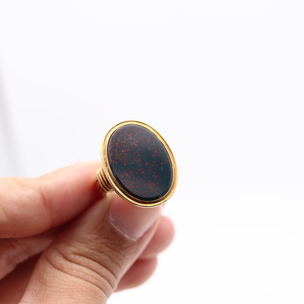 Bloodstone: Mount on top in a bezel setting, with 1 oval flat cabochon cut (18 x 24 x 4 mm) carved from natural bloodstone with an approximate weight of about 12.25 carats.