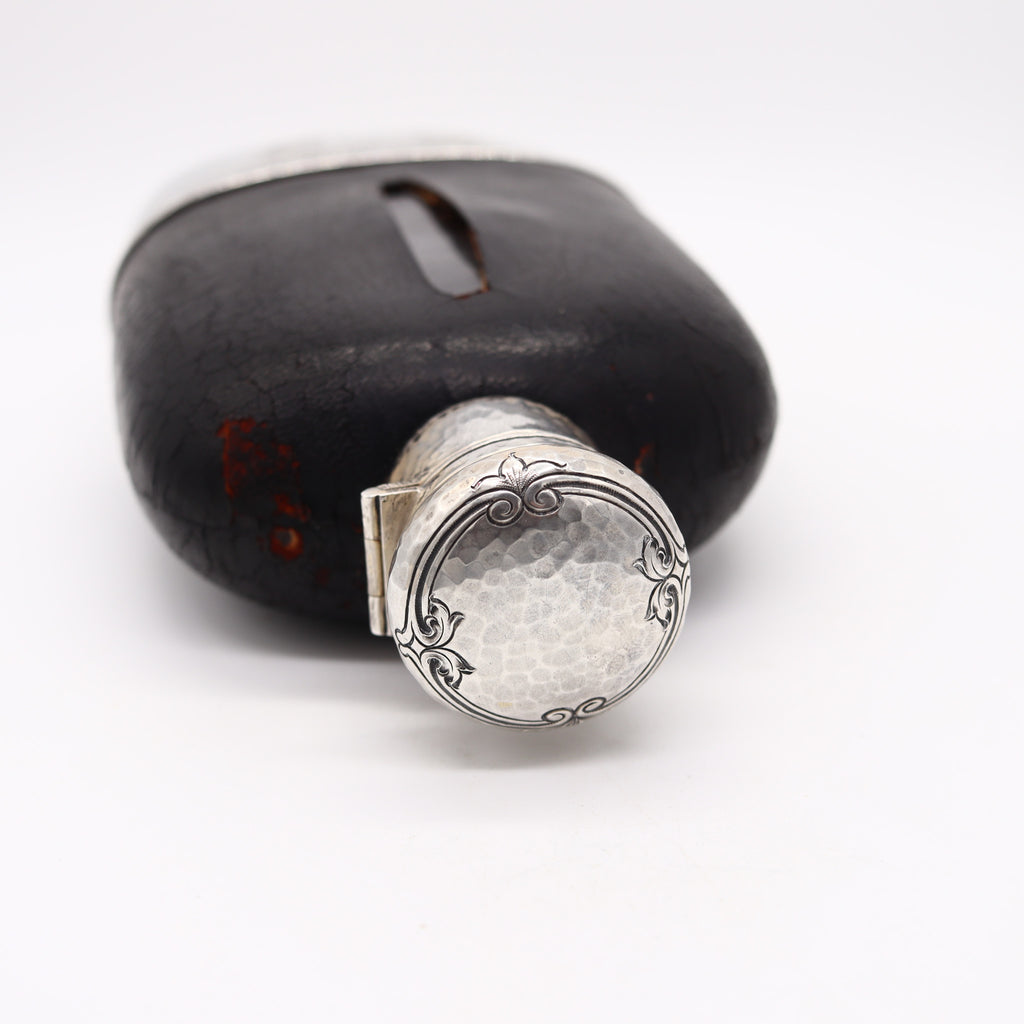 Very handsome and handy liquor flask bottle, created in America by the silversmiths of Gorham, back in the 1900. This beautiful large liquor flask has been crafted with parts made up in solid sterling silver of .925/.999, with hammered finish, clear glass and brown leather. It is fitted on top with a screwed hinged lid and a cork. This flask was retailed by the Boston based store of Bigelow Kennard & Co.