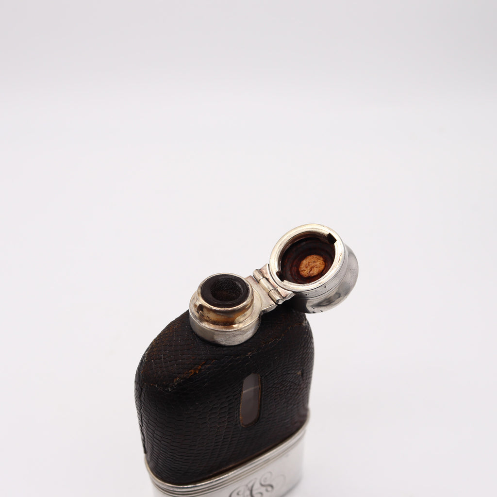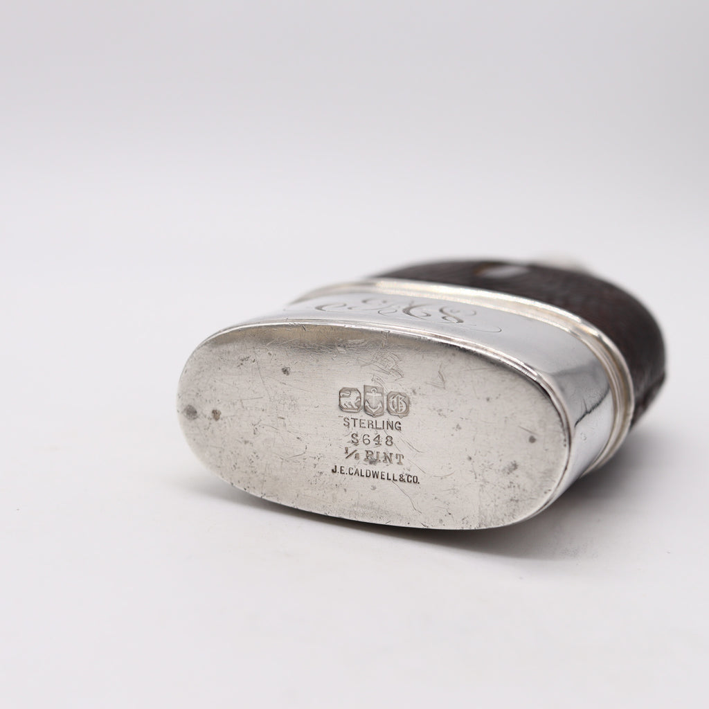 Very handsome and handy liquor flask bottle, created in America by the silversmiths of Gorham, back in the 1910. This beautiful small liquor flask is a very rare size, and has been crafted with parts made up in solid sterling silver of .925/.999, clear glass and brown leather. It is fitted on top with a screwed hinged lid and a cork. This flask was retailed by the Philadelphia based store of J.E. Caldwell & Co. .