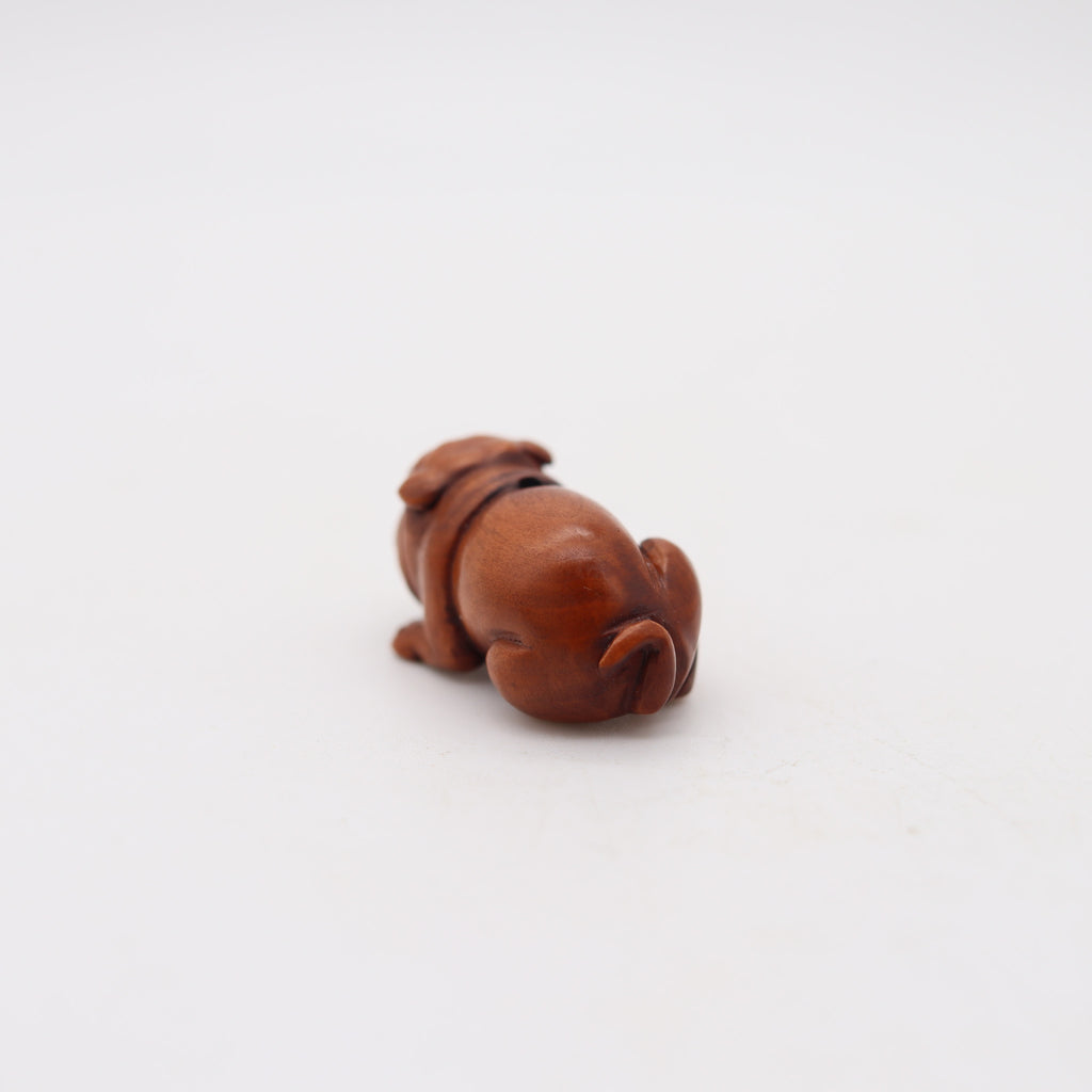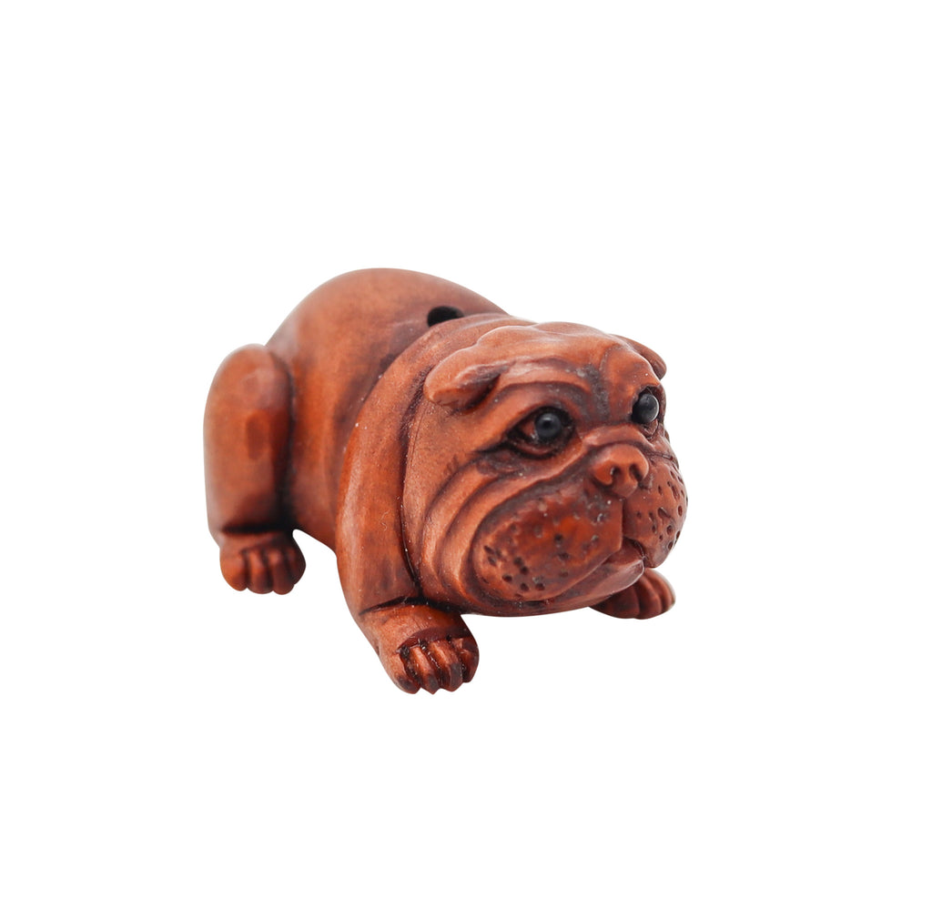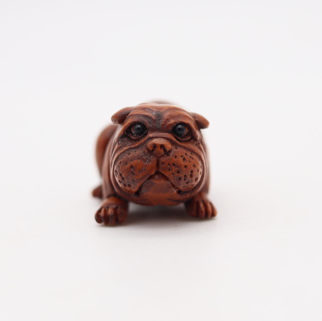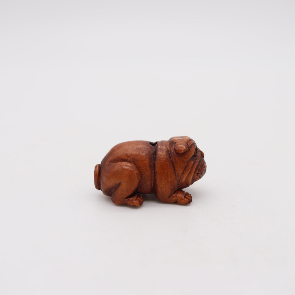 This is a beautiful and very cute ojime created in the imperial Japan during the Taishō period, circa 1920. The sculptural ojime was masterfully carved in the shape of a playful seated bulldog in precious wood with the eyes embellished with tiny round cabochons of black onyx. The detailed craftsmanship is very intricate and is a true pleasure to behold.