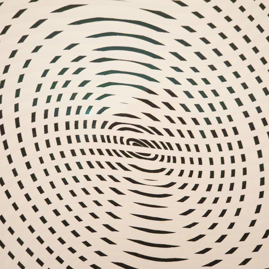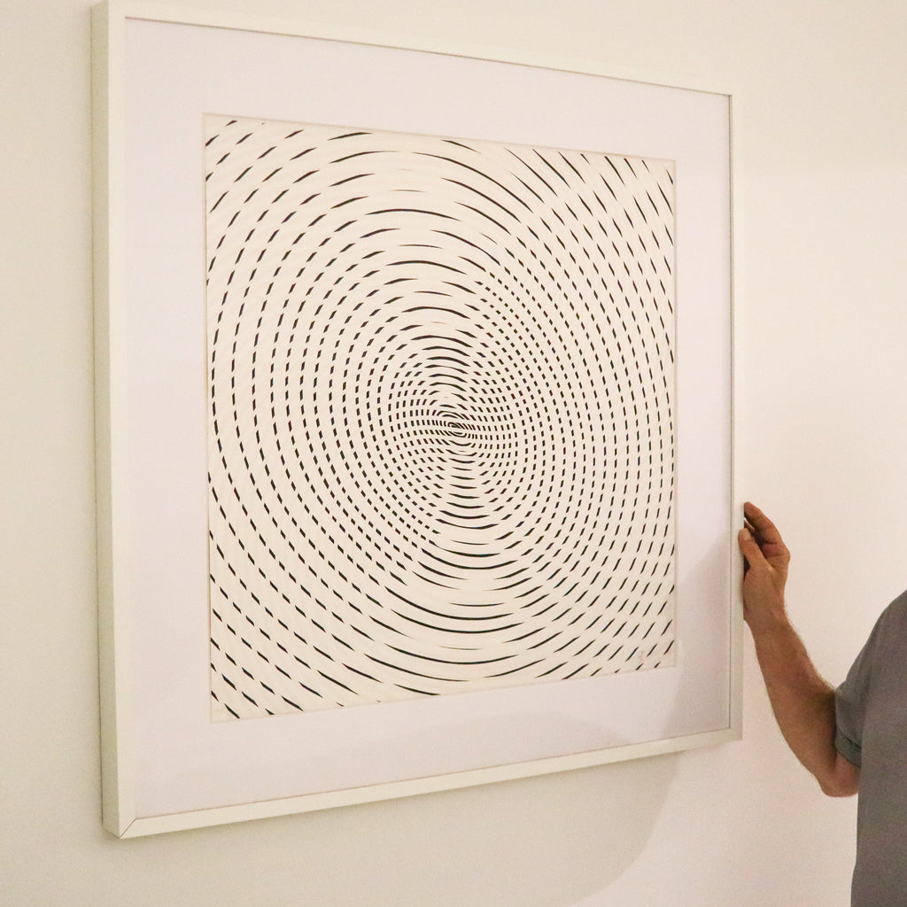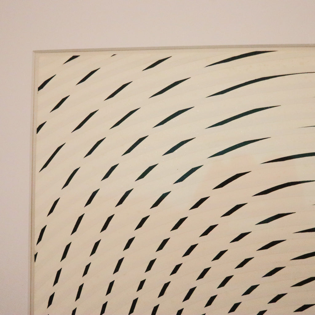 Spiral by the artist Rafael Jesús Soto, is a silkscreen print created in a limited edition between 1955 and 1983, captures the artist's exploration of optical movement and perception. The composition features a series of black, curved lines that radiate outward in a spiral pattern against a white background, creating a compelling illusion of depth and motion. As the viewer’s eye follows the concentric curves, the image appears to pulsate and shift, drawing the eye towards the center in a seemingly endless vortex. Soto, a pioneer in kinetic and Op Art, skillfully uses minimal elements to evoke a powerful visual effect that blurs the boundary between two-dimensional and three-dimensional space. This piece exemplifies Soto’s ability to manipulate perception through precise, repetitive patterns, inviting viewers to engage with the dynamic energy of visual illusion.