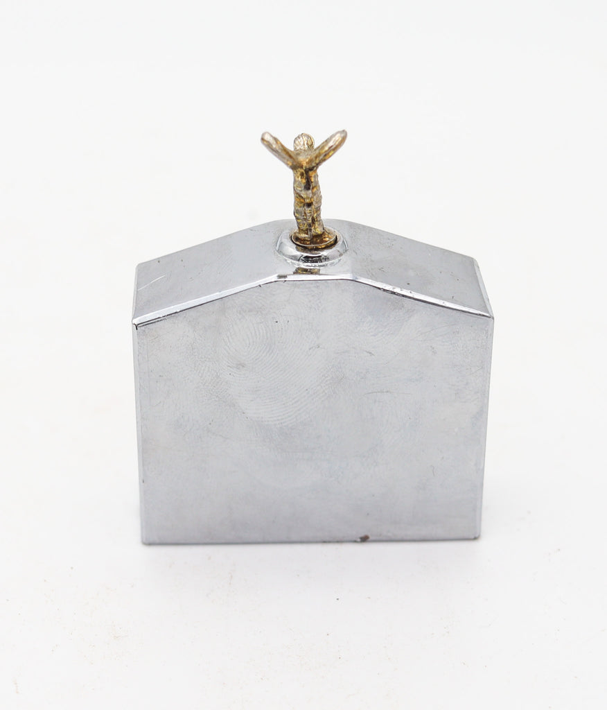 This is a beautiful pocket striker lighter created in London, England. The unusual striker was created for the Rolls Royce, back in the 1940-1950. This striker has been crafted in the shape of the radiator grill, with parts made up in chromed steel, gilt steel and black enamel. The lighter is fitted on top with the iconic Rolls Royce symbol, which you can slightly twist and use to ignite. This will be a great gift idea.