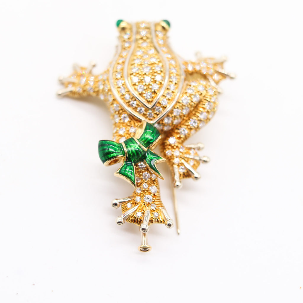 This is a very nice vintage brooch created by Tiffany & Co. back in the 1970. The brooch was designed in the shape of beautiful frog, masterfully crafted in solid yellow gold of 18 karats with high polished finish. Is it accented with a bow, which is embellished with applications of vivid green glass enamel and the body is mounted in pave setting with one-hundred-fifty-eight well-matched natural earth mined Diamonds. The diamonds are VVS white colorless and the frog's eyes are mounted with two natural Colombian green emeralds. The brooch is fitted at the reverse with double hinges pins bars and a trombone security lock.