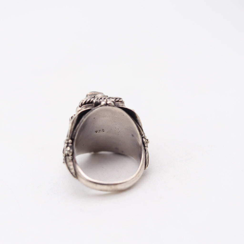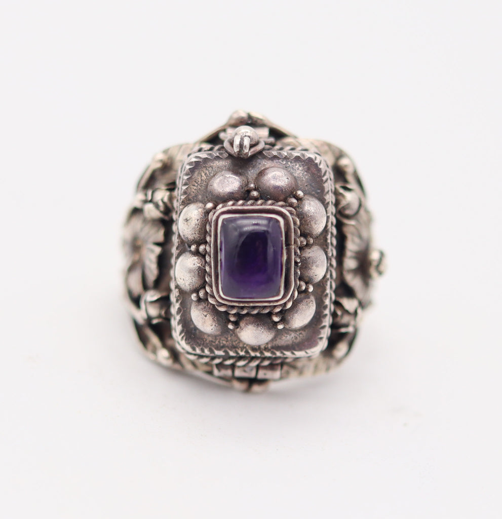 This is a very interesting poison-ring created during the art-deco period, back in the 1930's. The ring was crafted in the baroque style with a concealed hidden compartment in solid .925/.999 sterling silver and decorated with intricate floriated and twisted patterns. The hidden box is embellished on top with one natural amethyst and the lid is fitted with a three-barrels hinge with a figure eight security lock.