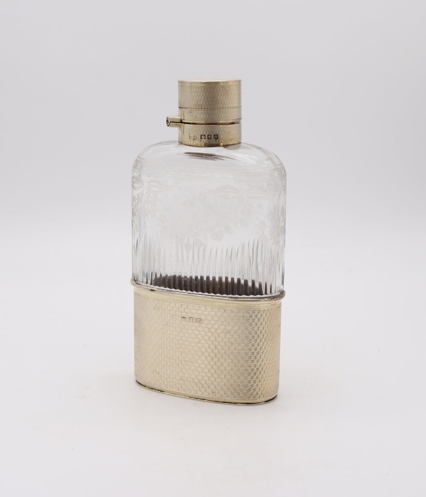 This is a very handsome and handy liquor flask bottle, created in London England by the silversmiths of Ernest Drew & Sons, back in the 1927. This beautiful liquor flask is very rare and has been masterfully crafted with parts made up in solid sterling silver of .925/.999, clear hand-cut glass. It is fitted on top with a screwed hinged lid and a cork.