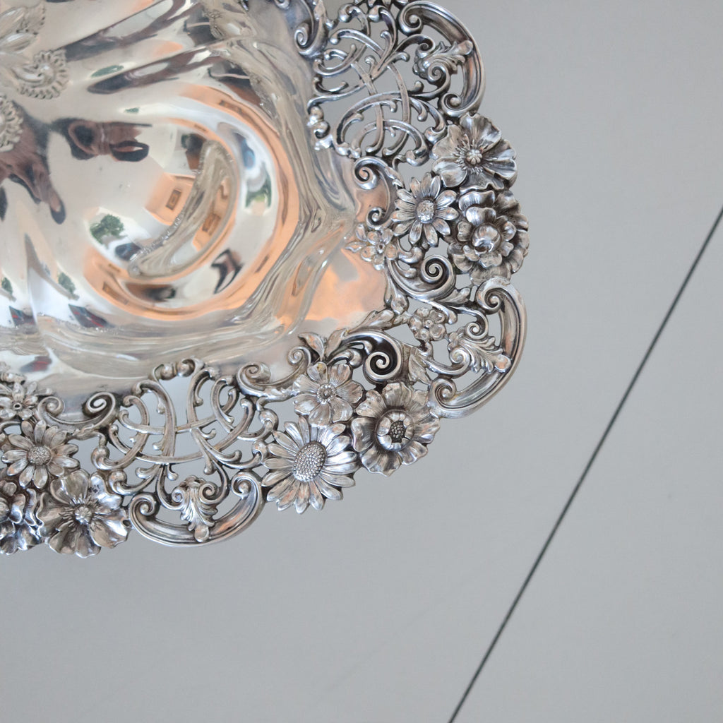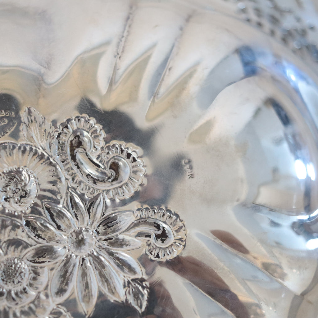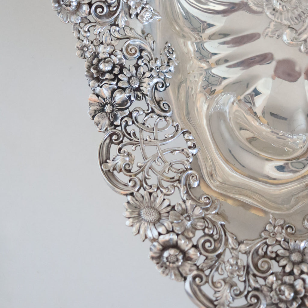 This is a magnificent large serving tray created in America by the silversmiths and jewelers based in Philadelphia of J.E. Caldwell & Co., back in the 1910. The fabulous tray has been masterfully hand crafted in solid sterling silver of .925/.999 with polished finish. Decorated in the Edwardian and art-nouveau style with intricate repousse patterns of American flowers. The reticulate work and the chiseled parts are stupendous, present beautiful with no dents, damages and is unmonogrammed.