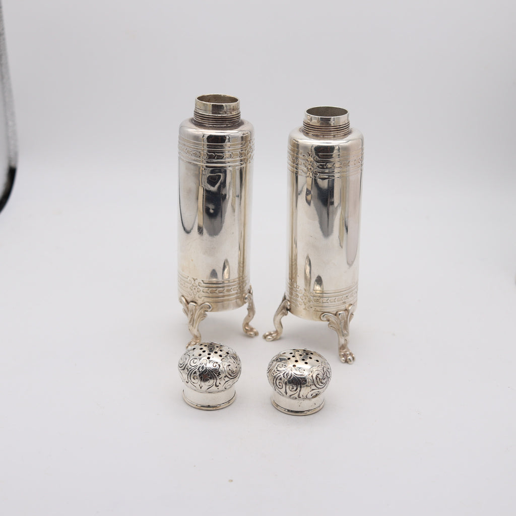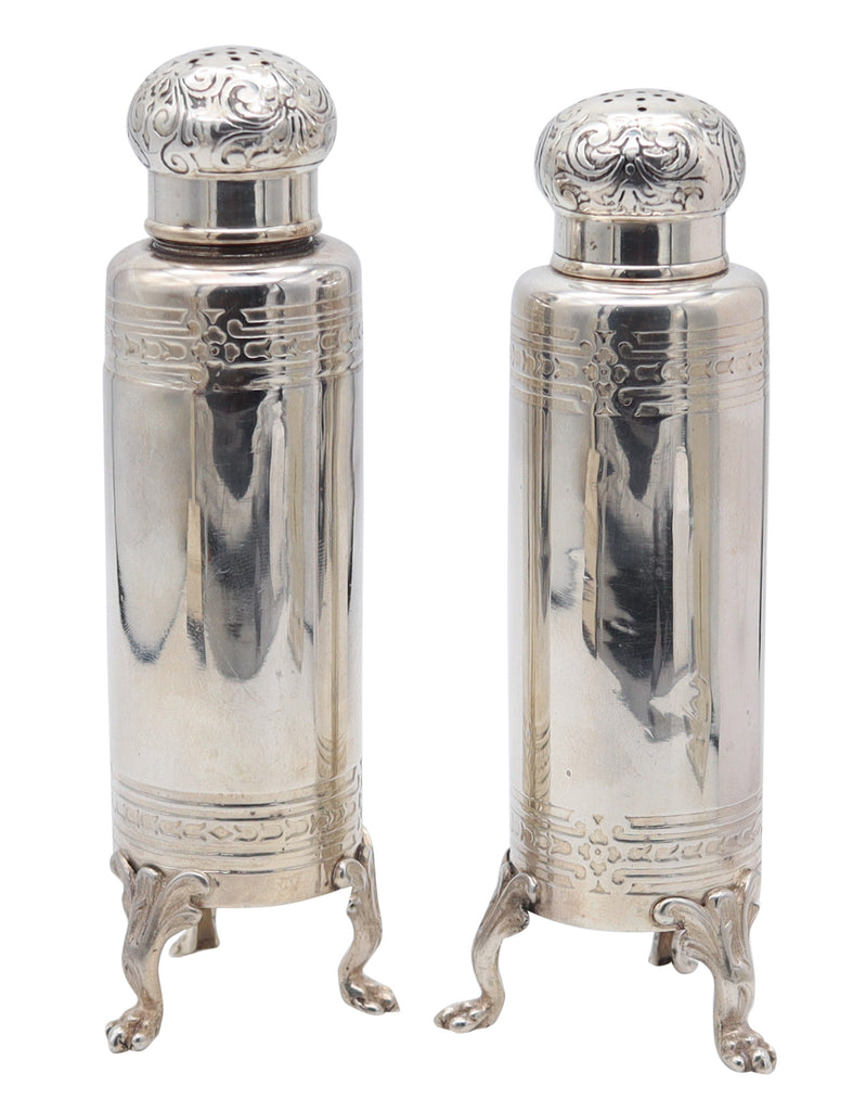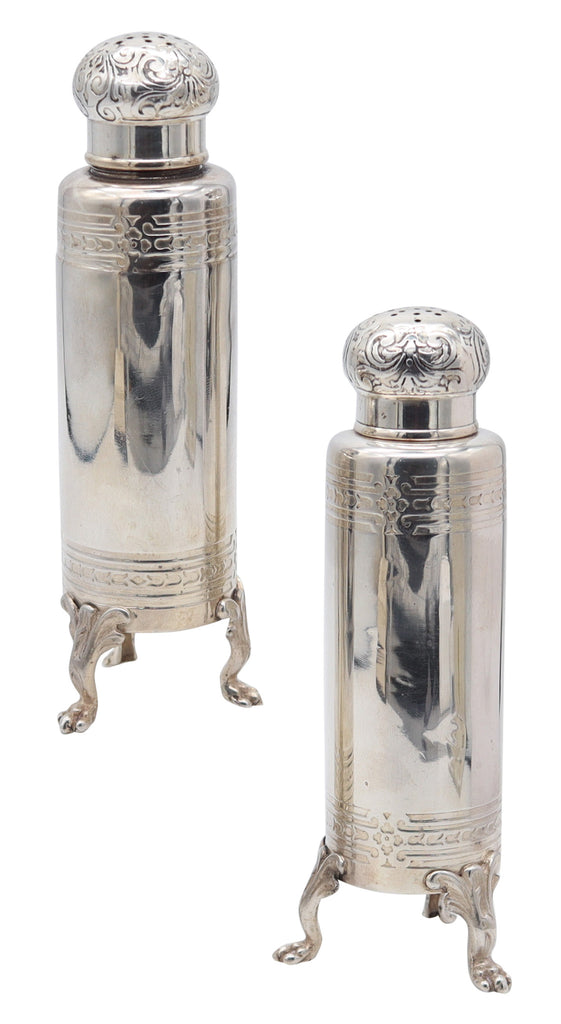 This is a beautiful pair of antique salt and pepper shakers created in 1902 at the Tiffany & Co. in New York City. This set is extremely rare and was carefully crafted in solid sterling silver .925/.999 under the directory period of John C. Moore (1907-1947). This is the model 15336G, designed as sleek cylinders with incised floriated and foliage patterns and mounted in three elaborated lion's feet. As with all Tiffany pieces, the quality and design are beyond compared. Exceptional and rare example of Tiffany's finest work.