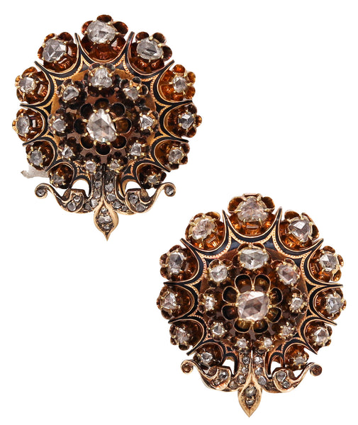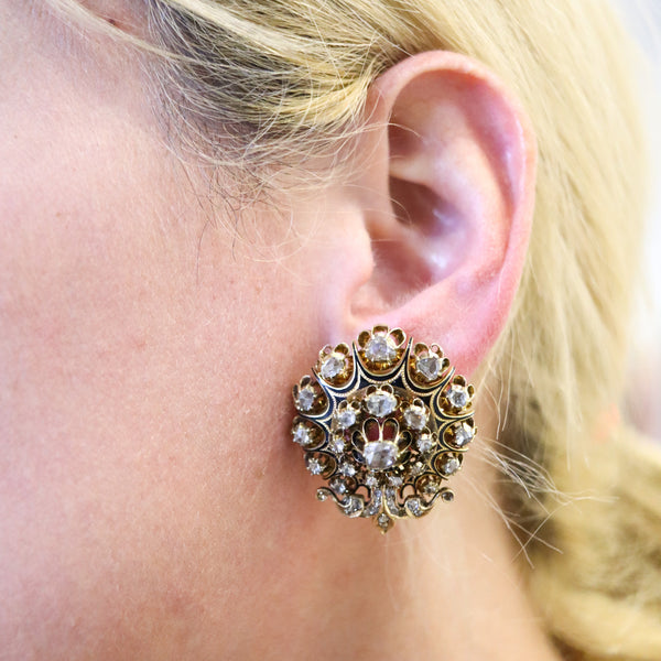 -Georgian 1785 Antique Earrings In 15Kt Gold And Enamel With 5.64 Ctw In Diamonds