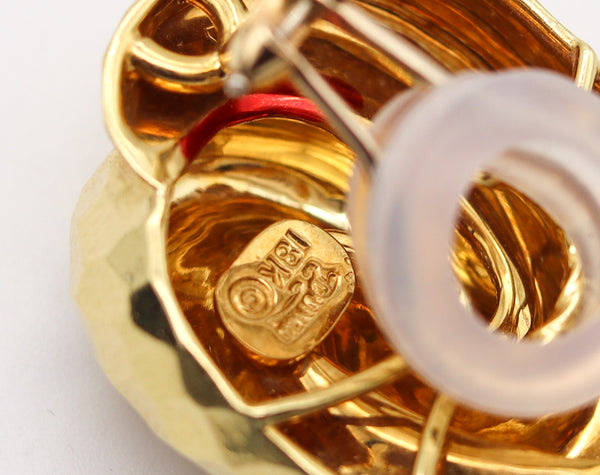 Beautiful bold ear-clips, created at the atelier of Henry Dunay in New York city, back in the 1990. They was crafted as a left and right in solid yellow gold of 18 karats with the entire surface finished with the iconic faceted patterns. Fitted with hinged French omega backs for fastening clip and if desired, the addition of posts for pierced ears can be easily done.