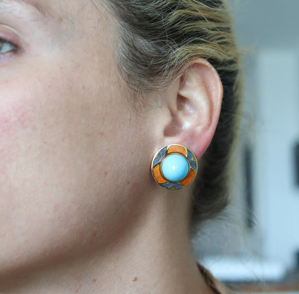 Beautiful and colorful statement geometric round earrings, created in London United Kingdom by the jewelry house of Leo De Vroomen, back in the 1993. This pair of earrings was carefully crafted in solid yellow gold of 18 karat, with high polished finish and fitted with hinged French omega backs for fastening clips. The optional posts for pierced ears can be easily added. Embellished with applications of hot enamel over a guilloche pattern.
