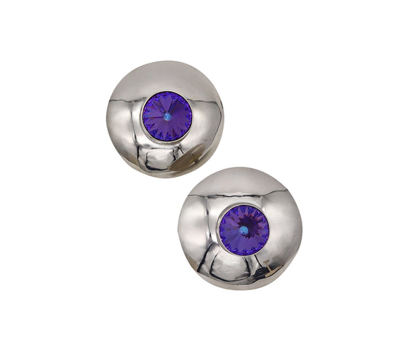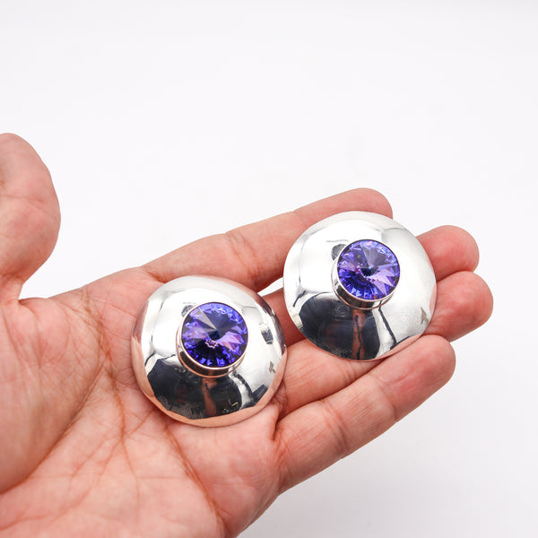 -Mexico 1970 Taxco Retro Modernist Earrings In Sterling Silver With Purple Faceted Glass