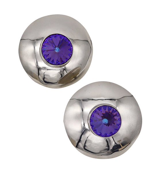 Gemstones: Mount in bezel settings, with 2 round faceted cut of polished vivid purple glass.